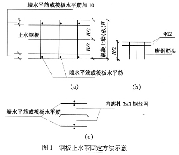 某工程建筑面積約12萬m,系框架剪力墻結構,地下二層。地卜室筏板、外墻及地卜室頂板后澆帶均設計采用300 mmx4mm的止水鋼板,總長為818.8 m。為了保證后澆帶處鋼板止水帶施工質量,對鋼板固定方式進行了改進(圖1)。此方法既保證了止水鋼板的位置,又能保證筏板水平筋或墻水平筋的間距。