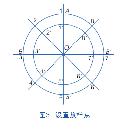 在井壁外布設A, A' , B, B‘這4個控制點,井壁中心布設O點為圓筒中心點,在井內、外壁上設置16個放樣點。放樣點采用全站儀控制,可準確控制井筒開挖尺寸