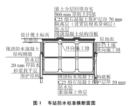 本工程的防水等級為一級,不得滲水。側墻及底板防水采用1. 5 mm厚高分子自粘膠膜防水卷材;頂板防水采用3 mm厚非固化橡膠瀝青防水材料+4 mm厚自粘聚合物改性瀝青防水卷材。車站防水標準橫斷面見圖。