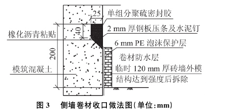 先將C'.PS高分子預鋪防水卷材按彈線位置對準在永久保護墻的基層上(本工程永久圍護連續墻的保護層厚度為70 mm,25 mm的深度不會對保護層造成巨大破壞),卷材的平滑光面面向永久圍護結構,顆粒層面向結構混凝土墻,采用機械固定的方式每隔400^600 mm進行機械固定,然后用相鄰卷材搭接覆蓋釘眼,搭接后立即用壓輥滾壓,密封粘結牢靠后用單組分聚硫密封膠封堵保護墻。具體做法見圖3。