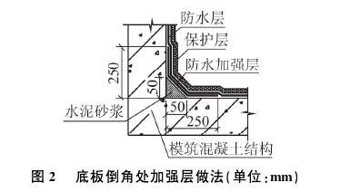 由于防水材料具有一定的硬度,不宜折成900直角鋪設,因此需在墊層與圍護墻體交角做出圓角或倒角。本工程采用1,2. 5水泥砂漿做成50 mmX 50mm的倒角,在其上鋪設250 mmX250 mm的倒角加強層,然后再大面積鋪設。具體見圖2。