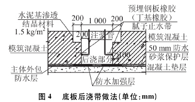 本工程的后澆帶設置在受力和變形較小的位置,寬度1 000 mm,其防水處理與施工縫的防水處理方法基本相同,不同之處在于后澆帶的截面形狀為企口型,需要兩側設置注漿管。后澆帶混凝土標號選用比兩側混凝土標號高一號的補償收縮混凝土,澆筑須在兩側混凝土齡期達到42 a后進行,且必須一次澆筑完成,不得留施工縫,養護時間不得少于2g a。具體做法見圖40