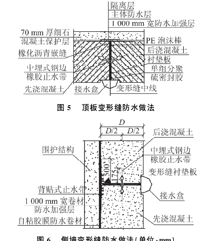 本工程底板及側墻變形縫采用不小于35 cm寬的中埋式鋼邊橡膠止水帶、1 000 mm防水加強層、35 cm寬背貼式止水帶、PE泡沫棒、單組分聚硫密封膠防水措施,側墻設置不銹鋼接水槽。