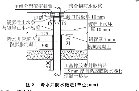本工程的降水井材質為水泥礫石濾水管,為了對水泥礫石濾水管周圍進行有效防水處理,采用套埋鋼管,其內回填微膨脹混凝土處理。套埋鋼管壁厚7 mm,套埋深度至墊層以下50 cm。鋼管與主體結構防水層交接處用丁基橡膠密封膠粘帶粘結底面寬300 mm、高250 mm的I二型防水加強層。在結構底板中間焊接厚10 mm的鍍鋅止水環,止水環寬度125 mm,止水環上部用緩膨性止水條密貼。降水井頂部用厚10 mm的鋼板與套埋鋼管焊接封口,焊接頂部用單組分聚硫密封膠密封,中間用聚合砂漿填充至與底板齊平。具體見圖