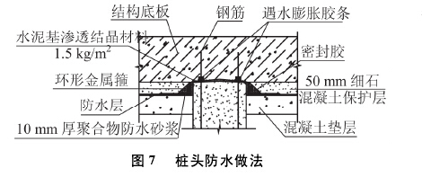 樁頭四周鑿毛并清理干凈,涂刷優質水泥基滲透結晶防水涂料,用量為2. 0 kg/mz,然后再抹10mm厚的聚合物防水砂漿,要求剛性防水層表面圓順、平整。樁頭部位需做防水加強層,加強層材料同底板,寬200 mm、高100 mm(與樁頭齊平),與防水層粘貼牢固。