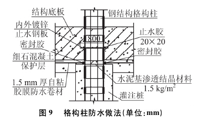 格構柱的防水處理方法如下:鉆孔灌注樁頂部及樁身頂部四周涂刷水泥基滲透結晶防水涂料,用量大于1. 5 kg/mz。灌注樁頂部鋪設與主體外防水材料相同的防水卷材,其連接處用密封膠封堵,在結構底板中部處焊接內外鍍鋅止水鋼板,鋼板厚5mm,民、寬均為800 mm,其上用止水膠密封,防水基面對應處若有空隙,須補焊鋼板。具體見圖90