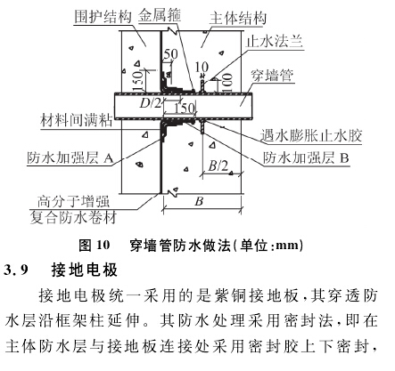 由于地鐵車站的復雜性和系統性,不可避免的會有各種系統的預留預埋管線穿墻設置,因此穿墻管的防水處理就成了地鐵車站的薄弱環節,處理不當極易漏水從而造成事故。穿墻管的防水處理方法如下:主體結構防水層包裹穿墻管50 mm,在其外增設兩層防水加強層A}B(A}B均為高分子增強復合防水卷材),A}B材料間滿粘。A防水加強層寬度為D/2(D為穿墻管直徑),B防水加強層寬度150mm,用金屬箍固定至穿墻管上。在1/2墻寬位置焊接止水法蘭(厚度10 mm,高110 mm ),連續滿焊,并作好防腐處理,止水法蘭根部用遇水膨脹止水膠密封,密封嵌填必須密實、連續、飽滿,粘結牢固。具體見圖l00