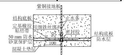 在其上施作寬100 mm、高50 mm的I二型丁基橡膠粘結帶,高處用細鐵絲綁扎,再沿接地板一定高度增設兩道止水條。具體做法見圖
