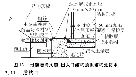 地連墻頂部與樁頭防水做法相同,首先刷一層水泥基滲透結晶,在連續墻鋼筋上套遇水膨脹止水條。連續墻與風道、出入口相交位置用密封膠密封,其上用金屬壓板固定牢固后,澆筑混凝土。做法見圖12。