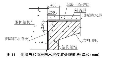 本工程由于側墻與頂板防水所用材料不同,因此,由側墻過渡到頂板的防水施工也是質量控制的關鍵點。具體做法為:首先在拐角位置做250 mmX250mm的防水加強層,防水加強層材料同側墻防水材料。其次將頂板防水平鋪至拐角位置,然后將側墻防水順包400 mm。側墻防水與頂板防水均為自粘系列材料,充分利用自粘特性進行過渡搭接。做法見圖140