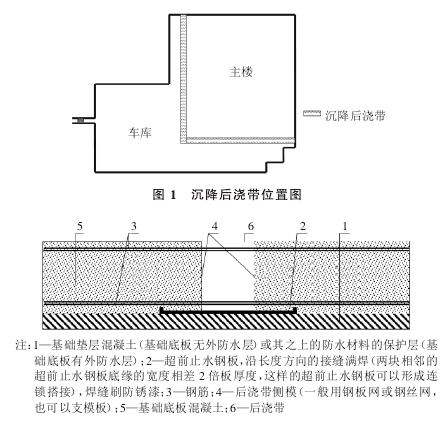 聊城市民文化中心工程地理位置東臨徒駭河景觀大道,西至王宅北街,南起東昌路,北至振興路,由聊城昌潤住房開發建設有限公司建設,用地面積122畝,主體建筑面積83 000耐,其中地上56 000 m-,地下27 000廳。建筑層數為地下1層,地上5層。包括文化藝術館、青年館、職工活動館、科普館、婦女兒童館、老年館、停車場、商場、飲食服務等。地下車庫結構為板柱一抗震墻結構,基礎形式為筏板基礎+柱墩,屋蓋采用柱支撐現澆密肋樓蓋形式。主樓與車庫之間設置了沉降后澆帶,如圖1所示,為了能夠在后澆帶封閉澆筑前提前停止降水,節省工程成本,考慮采用中國建筑材料科學研究總院專利后澆帶超前止水技術。超前止水鋼板安裝及構造示意圖見圖2,圖3、