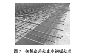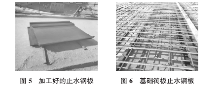 按照圖紙要求,在綁扎基礎筏板鋼筋以前,將止水鋼板鋪設好,見圖6。
