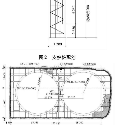 本工程支護系統設計確定支護樁樁頂位于地表以下2m,樁徑1.2 m,樁長26m,共設279根,水泥土攪拌墻墻頂位于地表以下lm,有效深度32. 5m,周長約400m。水平支撐采用鋼筋混凝土結構,共設3道,每道支撐與支護樁之間設置1道封閉腰梁,不設帽梁,其中第2,3道水平支撐兼作正式結構樓板,第1道水平支撐在施工正式樓板前需要拆除。支撐結構豎向采用立柱及托樁支頂,其中,立柱采用} 200 x 18等邊角鋼焊接為鋼格構柱,立柱截面尺寸500mm x 500mm,支托樁樁徑為cb850mm,樁體混凝土采用C25 ,鋼格構柱頂部錨人支撐梁及環梁內,鋼格構柱下部錨人支托樁內2 500mm。支護樁配筋如圖2所示。第2,3道支撐梁板平面如圖3 ,4所示。
