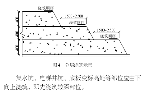 本工程基礎底板厚1200 mm,分3層澆筑,每層厚400 mm(圖4)。1 SOOmm厚底板分4層澆筑,最上層厚300 mm,其余每層厚400mm; 800mm厚底板分兩層澆筑,每層厚400 mm。先隨底板澆至底板高度,隨后向上分層澆筑。分段分層從底層開始澆筑,進行2}3 m后由第2臺汽車泵澆筑第2層,再由兩臺汽車泵依次澆筑以上各層。
