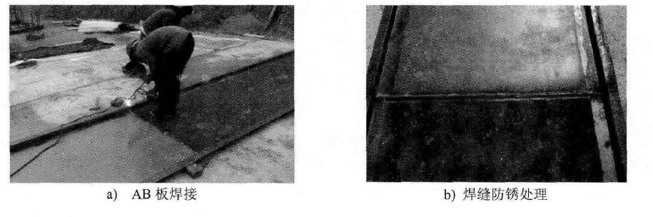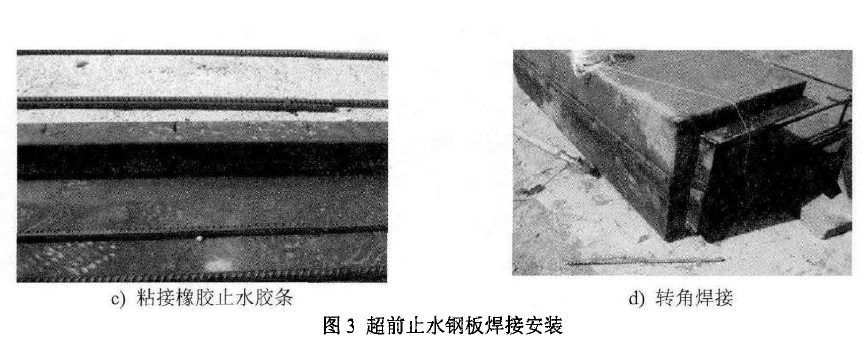 超前止水鋼板沿長度方向的接縫滿焊,兩塊相鄰的超前止水鋼板底緣的寬度相差2倍板厚度,這樣的超前止水鋼板可以形成連鎖搭接,并在焊縫刷防銹漆。超前山水鋼板現場安裝施工見圖30