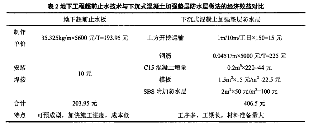 后澆帶超前止水技術與傳統沉式混凝土加強墊層防水層做法的經濟分析對比見表2。