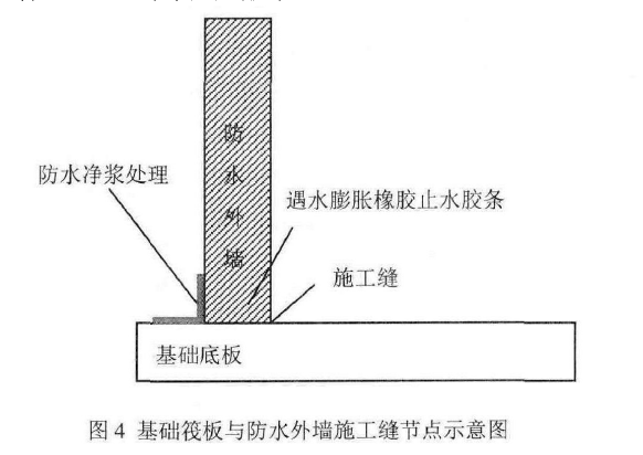 (5)施工縫處理:拆除外墻模板后,立即將基礎底板和外墻接合處迎水面表面清理干凈,采用聚合物水泥砂漿,對迎水面施工縫上、下不少于100mtn范圍進行涂抹處理,或者對施工縫內、外側同時進行處理,如果外墻的外模是磚砌的永久性模板,則僅需在施工縫內側進行處理,聚合物水泥砂漿的厚度為(0.5^'S)~,潮濕養護14天。