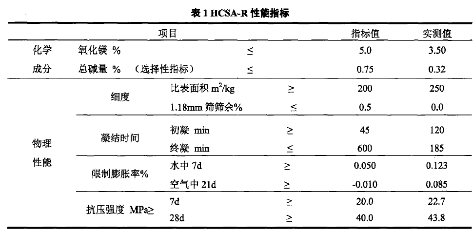 CPC化學預應力混凝土可以產生1.OMPa的化學預應力,確保混凝土在使用期間不會產生收縮裂縫漏水。化學預應力混凝土配制的核心材料是中國建筑材料科學研究總院開發的HCSA-R水化熱抑制型混凝土膨脹劑,該膨脹劑不僅具有優良的膨脹性能,而且配制的混凝土密實保水,不易產生漏振缺陷,最大程度減少混凝土出現施工瑕疵。按照現行國家標準GB23439-2009《混凝土膨脹劑》檢測,HCSA-R性能指標見表to