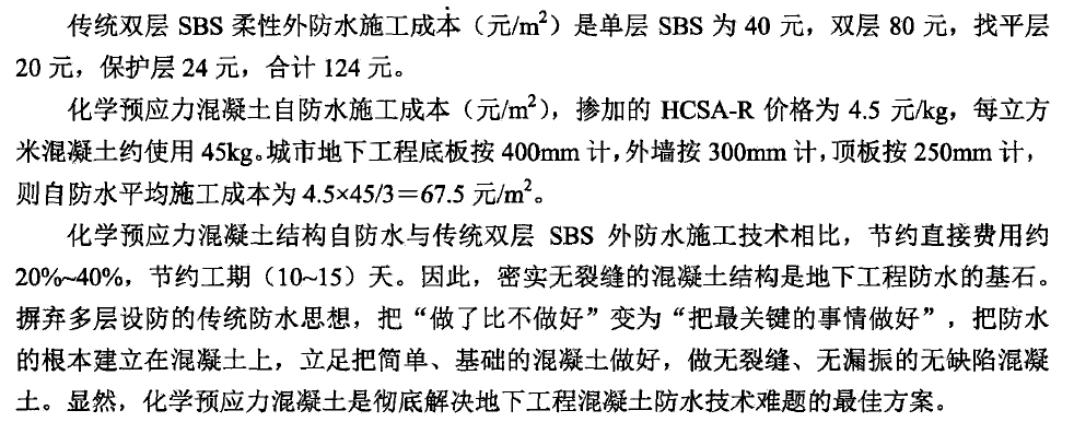 無數的地下工程防水實踐證明,無裂縫、無漏振缺陷的混凝土才是地下工程防水的唯一保障。化學預應力混凝土[}3} ( Chemically prestressed concrete CPC)是中國建筑材料科學研究總院趙順增教授所率科研團隊經多年研究和工程實踐開發的一項地下工程混凝土結構防水新技術。它主要是以高性能的化學預應力混凝土技術為核心,采用性能優良的混凝土膨脹劑,將摻加膨脹劑混凝土的應用范圍從目前的補償收縮延伸到預應力領域,使工程不產生收縮裂縫,實現工程中的無裂縫混凝土。與現有的機械預應力技術相比,化學預應力混凝土顯然具有顯著的經濟技術優勢,將為建筑設計和施工帶來革命性變革。