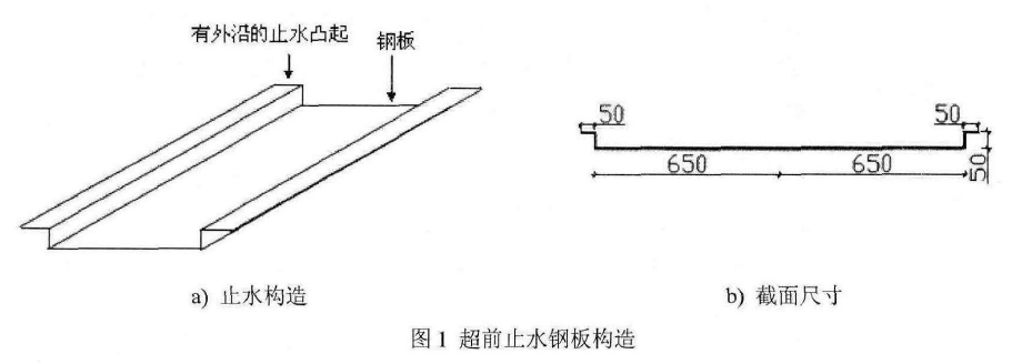地下工程超前止水技術原理是[[4]:直接在基礎墊層混凝土預留后澆帶的部位鋪設帶有止水構造的超前止水鋼板,鋼板厚度3mm,寬度為后澆帶寬度加。兩塊超前止水。