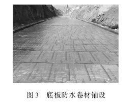 防水卷材的搭接部位采用自粘密封的方式,同一相鄰兩幅卷材短邊搭接縫錯開的距離不應小于500 mm。上下兩層和相鄰兩幅卷材的接縫應錯開1 /3一1 /2幅寬,且兩層卷材不得相互垂直鋪貼。鋪設時排除卷材下面的空氣,輥壓粘貼牢固。底板防水卷材鋪設見圖3。