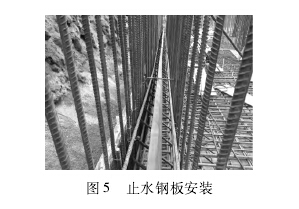 止水鋼板的定位可采用焊接定位鋼筋的方法;止水鋼板在墻體轉角處嚴禁斷開,加工成與墻體轉角相同的角度;止水鋼板采用雙面焊搭接施工,搭接長度不得小于10 cm,不得焊傷止水鋼板,為保證焊接質量,在具備良好的場地及施工條件下,先把止水鋼板在外焊接成整體,再移至設計位置。止水板安裝見圖