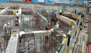 由于分區拆換支撐,會使圍護結構在水平受力上局部產生突變。考慮圍護結構是排樁結構,水平力系轉換時,在最大高差位置是最危險工況,經設計驗算,圍護樁的強度和剛度滿足施工工況需求,同時驗算各層環梁的截面也滿足要求。因而分區換撐是可行的。