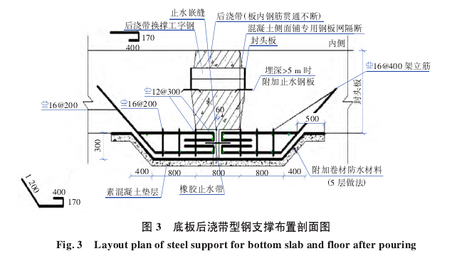 在底板及樓板后澆帶位置、樓梯洞口、電梯井、汽車坡道等部位設置型鋼支撐以保證結構連續,滿足水平推力傳遞。具體參見圖3、圖4。依據各層推力值確定型鋼截面規格和支撐間距。