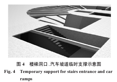 2)在臨近基坑周邊樓梯、電梯井、汽車坡道、洞口位置設置臨時支撐;