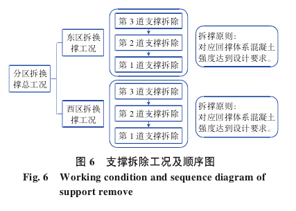 支撐拆除工況及順序見圖6所示。各道支撐拆除前,將正式結構和圍護結構之間的間隙,按設計出具的回撐梁結構施工完成,回撐梁結構混凝土強度達到100%后即可拆除支撐。