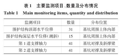 基坑拆換撐過程監測主要監測項目有:圍護結構頂部水平位移、圍護結構頂部沉降、周邊地表沉降、支撐立柱頂部沉降、圍護結構深層水平位移(測剎、周邊土體測斜、地下水位、各道支撐軸力等。針對圍護結構頂部水平位移、圍護結構深層水平位移(測剎、第1道支撐軸力和第2道支撐軸力4個項目進行重點分析,探究拆換撐對基坑物理狀態的影響。4個主控項目的監測點分布及數量見表1所示。