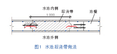 2)設計底板采用膨脹加強帶,寬2m;池頂及頂板設后澆帶,寬1 m(圖1)。澆筑混凝土采用補償收縮混凝土,強度等級提高一級。