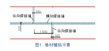 陰角部位在鋪貼卷材前1d需使用水泥砂漿抹成圓弧狀。筏板基礎中的陰陽角處、后澆帶等部位設置防水附加層。附加層卷材使用雙面反應粘高分子防水卷材,現場按寬500 mm進行裁剪,鋪貼時雙面隔離膜撕除。