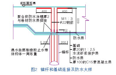 筏板基礎中部分承臺設計有抗浮錨桿,抗浮錨桿的防水細部處理一定程度上影響整個筏板的防水質量。為保證防水效果,抗浮錨桿細部防水具體做法為:錨桿周邊涂刷200 mm聚合物防水涂膜(厚2 mm,根部涂刷高50 mm,使其方便與防水卷材搭接處理。在墊層施工時,需環每根抗浮錨桿設置1圈遇水自膨脹橡膠止水帶(圖2)。