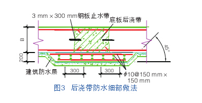 后澆帶處單面反應粘高分子防水卷材設置2道,在后澆帶加強層上下表面各設置1道。粘貼時同樣粘接面朝上,不粘面朝下,加強層處卷材鋪貼時必須與筏板底部的防水卷材連通。同時后澆帶兩側設置3 mm X 300 mm的止水鋼板 (圖3)。
