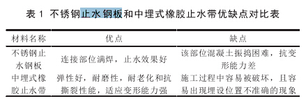 常規施工程序是先做地下室后做汽車坡道,所以仲縮縫兩側混凝土澆筑時間相隔較長,對埋入后澆混凝土部分的另一半外露比水帶沒有采取有效的保護措施,致使中埋式橡膠比水帶在施工過程中受到不同程度的破壞,例如鋼筋、模板上的釘子、人為破壞等。不銹鋼比水鋼板人為經常踩踏,在施工之前復位時鋼板裂縫或接頭斷裂。不銹鋼比水鋼板和中埋式橡膠比水帶優缺點比較如表1所示。