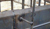 三、剪力墻拉筋及定位鋼筋焊接:剪力墻拉筋設置,由于剪力墻拉筋間距較小,中間總有一道穿過止水鋼板,止水鋼板接縫焊好后,在穿過止水鋼板的拉筋處把拉筋切斷,然后焊接在止水鋼板上,并在其拉筋切斷位置處加設一道拉筋,作為拉筋的補強鋼筋。