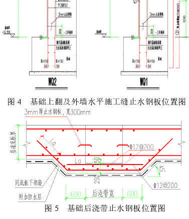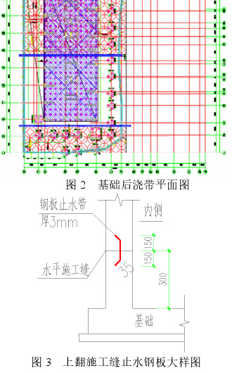 工程地下三層結(jié)構(gòu),結(jié)構(gòu)跨度 216m×86m(最寬處),屬超長地下結(jié)構(gòu),結(jié)構(gòu)采取措施以減少混凝土收縮和溫度應(yīng)力的影響,基礎(chǔ)、梁板縱橫向各設(shè)置數(shù)道后澆帶(帶寬 800mm)[1],具體位置詳基礎(chǔ)后澆帶平面圖。工程采用鋼筋混凝土自防水及卷材防水做法,防水混凝土設(shè)計抗?jié)B等級 P8,要求連續(xù)不間斷施工。防水混凝土的施工縫、穿墻管道預(yù)留洞、轉(zhuǎn)角、坑槽、后澆帶等地下工程薄弱環(huán)節(jié)應(yīng)嚴(yán)格按《地下防水工程質(zhì)量驗收規(guī)范》GB50208-2011 執(zhí)行。防水層、止水帶、止水條等必需有效交圈,不得斷開。 根據(jù)圖紙設(shè)計要求,有防水要求的后澆帶斷口必須設(shè)置封閉的止水鋼板,包括地下室外墻,地下室基礎(chǔ)(筏板、抗浮板)、地下室頂板(室外部分),止水鋼板寬 300mm,厚度為 3mm,止水鋼板總長度3200m。 在基礎(chǔ)底板上翻 300mm 位置外墻留置水平施工縫,施工縫位置放置止水鋼板。同樣在地下二層及地下一層樓板上翻 300mm 位置外墻留置施工縫及止水鋼板。 在基礎(chǔ)底板及外墻后澆帶兩側(cè),底板及外墻厚度居中埋置止水鋼板,凹口朝向迎水面。