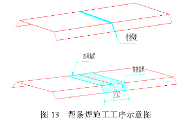 幫條焊施工工藝 與定型構(gòu)件連接難操作位置以及部分底板厚度較小,止水鋼板居中設(shè)置搭接后,因底部操作面過小,底面搭接處滿焊難以施工時,采用對接焊接后再單面幫條焊的方式。