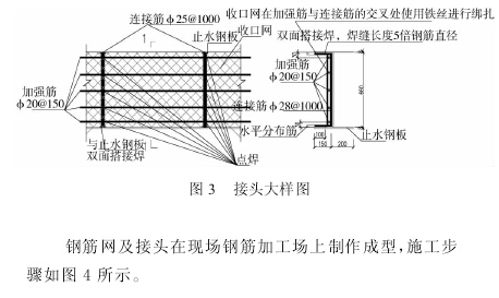 雙比水鋼板采用兩塊鋼板與鋼筋網(wǎng)的水平筋焊接固定,同時(shí)在兩塊比水鋼板之間焊接連接筋和加強(qiáng)筋以形成隔離網(wǎng)的骨架,之后在鋼筋網(wǎng)內(nèi)側(cè)將收日網(wǎng)固定在連接筋和加強(qiáng)筋上形成混凝土隔離網(wǎng),通過(guò)混凝土隔離網(wǎng)來(lái)阻比先施工槽段混凝土在澆筑過(guò)程中滲流到后施工槽段,起到隔離工、且期混凝土的作用,大樣如圖3所示。
