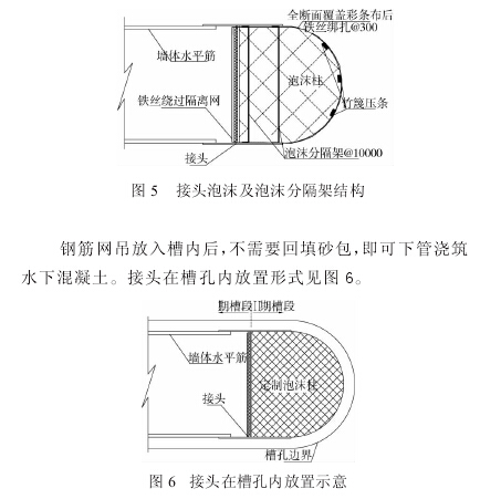為防比工期槽段水下混凝土澆筑時(shí)繞流至且期槽段接頭位置,造成且期接頭位置槽孔施工困難,接頭質(zhì)量難以保證,創(chuàng)新地采用半圓形泡沫柱十泡沫分隔架的結(jié)構(gòu)形式確保接頭與繞流混凝土的有效分隔,同時(shí)避免了以和接頭回填砂包小密實(shí)、砂包對(duì)后期成孔的影響。經(jīng)計(jì)算,該構(gòu)造措施可以滿足泡沫柱的浮力要求,半圓形泡沫柱十泡沫分隔架結(jié)構(gòu)形式見(jiàn)圖5