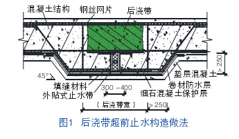 根據CB 50108-2008《地下工程防水技術規范》第5.2.14條,后澆帶需超前比水時,后澆帶部位的混凝土應局部加厚,并應增設外貼式或中埋式比水帶,并給出構造圖(圖1)。